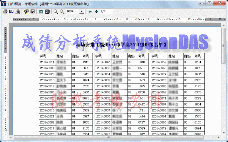 本模块用于考试时安排考场之用,系统采用随机打乱编考场的方法进行考场编排,支持单双数考场考生人数不一样,支持文理科不交叉在同一考场,个人版和试用版不支持考场、考号等数据存盘和打印功能。有关注意事项请点击窗体上的帮助即可,下图(截图来自网络版)为系统自动生成的报表: