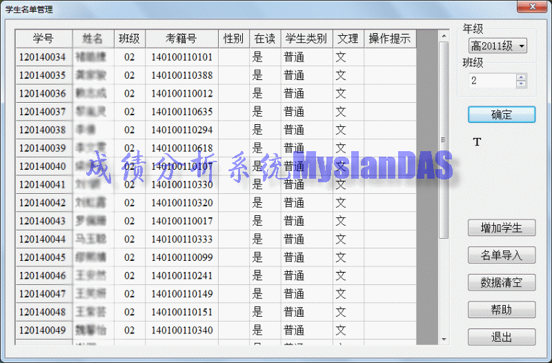 本模块用于录入或从其它数据库中批量导入学生名单,为考试输入成绩和统计分析做准备。有关注意事项请点击窗体上的帮助即可,界面如下图(截图来自网络版):