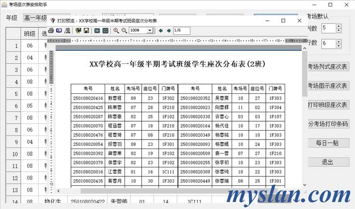 考场编排助手提供根据考试需求自动排考场、打印各考场学生座次表、各班考场分布表,各考场考生条码打印等功能,支持新高考选科走班。
